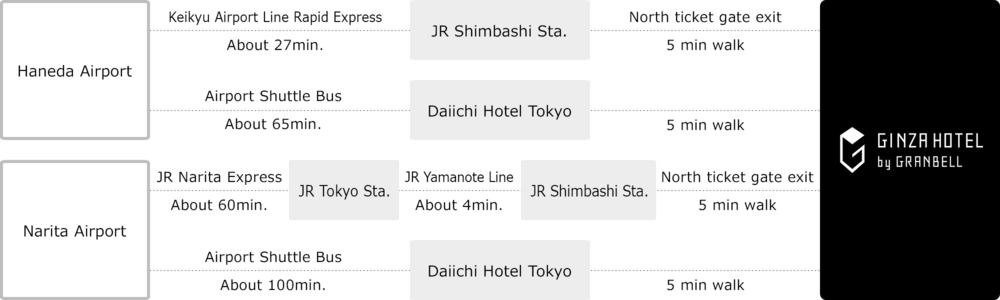 ・Approximately 27 minutes on the Keikyu Airport Line Rapid Express, then a 5-minute walk from Shinbashi Station