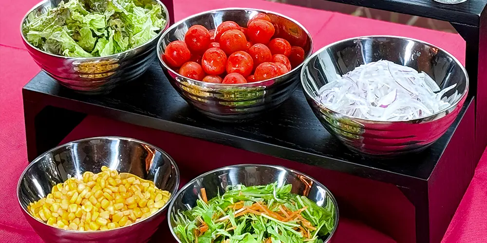We offer a variety of toppings, including bacon and fried onions, centered around fresh vegetables of the day.