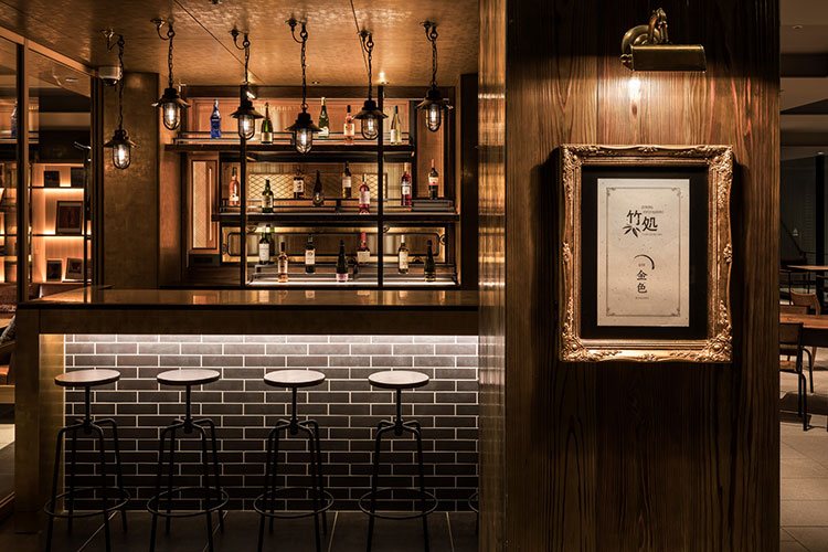 The shining golden bar counter is set against a 100-year-old transom and a gold leaf sake shelf.