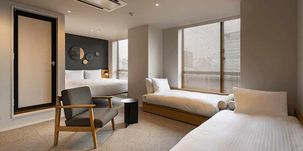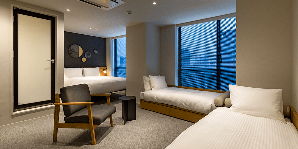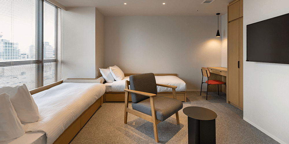 Located on the 16th to 18th floors, this double room can accommodate up to four people. It is a spacious family-type room with one Queen bed and two sofa beds. It is ideal for families, groups, or long-term stays. There is also space under the bed to store suitcases and other items.