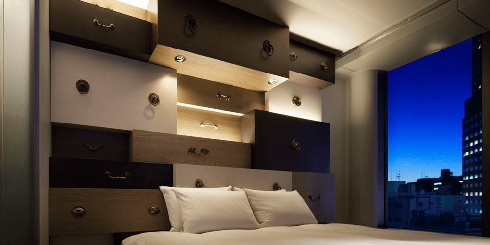 A room of drawers. Drawers with various functions, such as lighting, shelves, and a bed, are laid out along an entire wall.