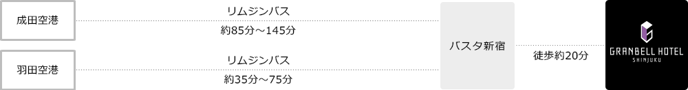 ・Approx. 85-145 minutes from Narita Airport to Shinjuku Expressway Bus Terminal by limousine bus / Approx. 20 minutes walk from Shinjuku Expressway Bus Terminal