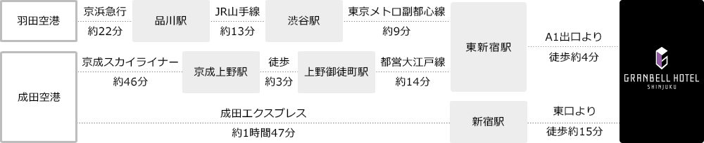 ・From Narita Airport take the Keisei Skyliner to Keisei Ueno Station (approx. 46 minutes), then take the Toei Oedo Line from Ueno Okachimachi Station to Higashi-Shinjuku Station (approx. 14 minutes)